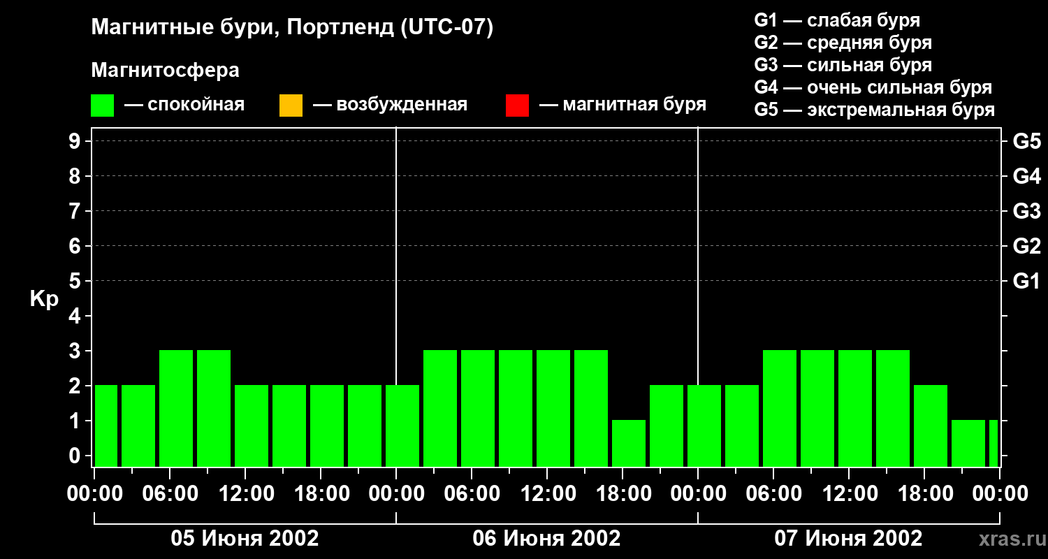 Изменения геомагнитного индекса Kp с 5 по 7 июня 2002 года для средних широт