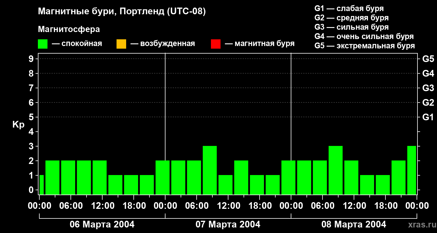 Изменения геомагнитного индекса Kp с 6 по 8 марта 2004 года для средних широт