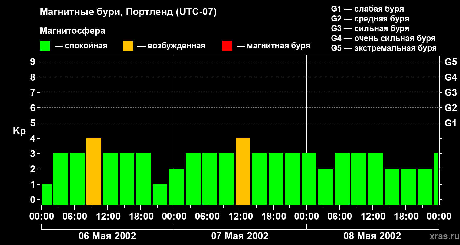 Изменения геомагнитного индекса Kp с 6 по 8 мая 2002 года для средних широт