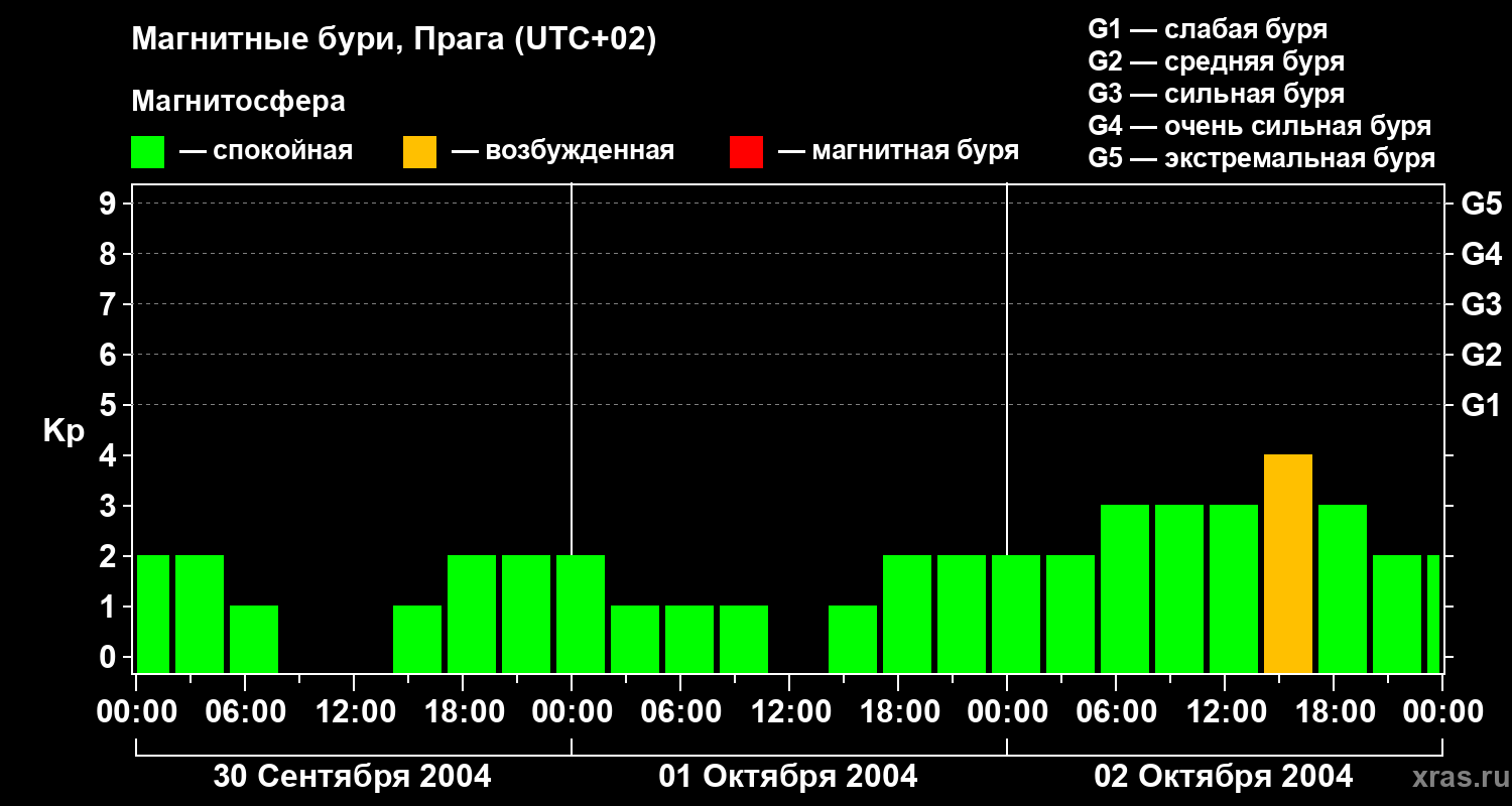 Изменения геомагнитного индекса Kp с 30 сентября по 2 октября 2004 года для средних широт