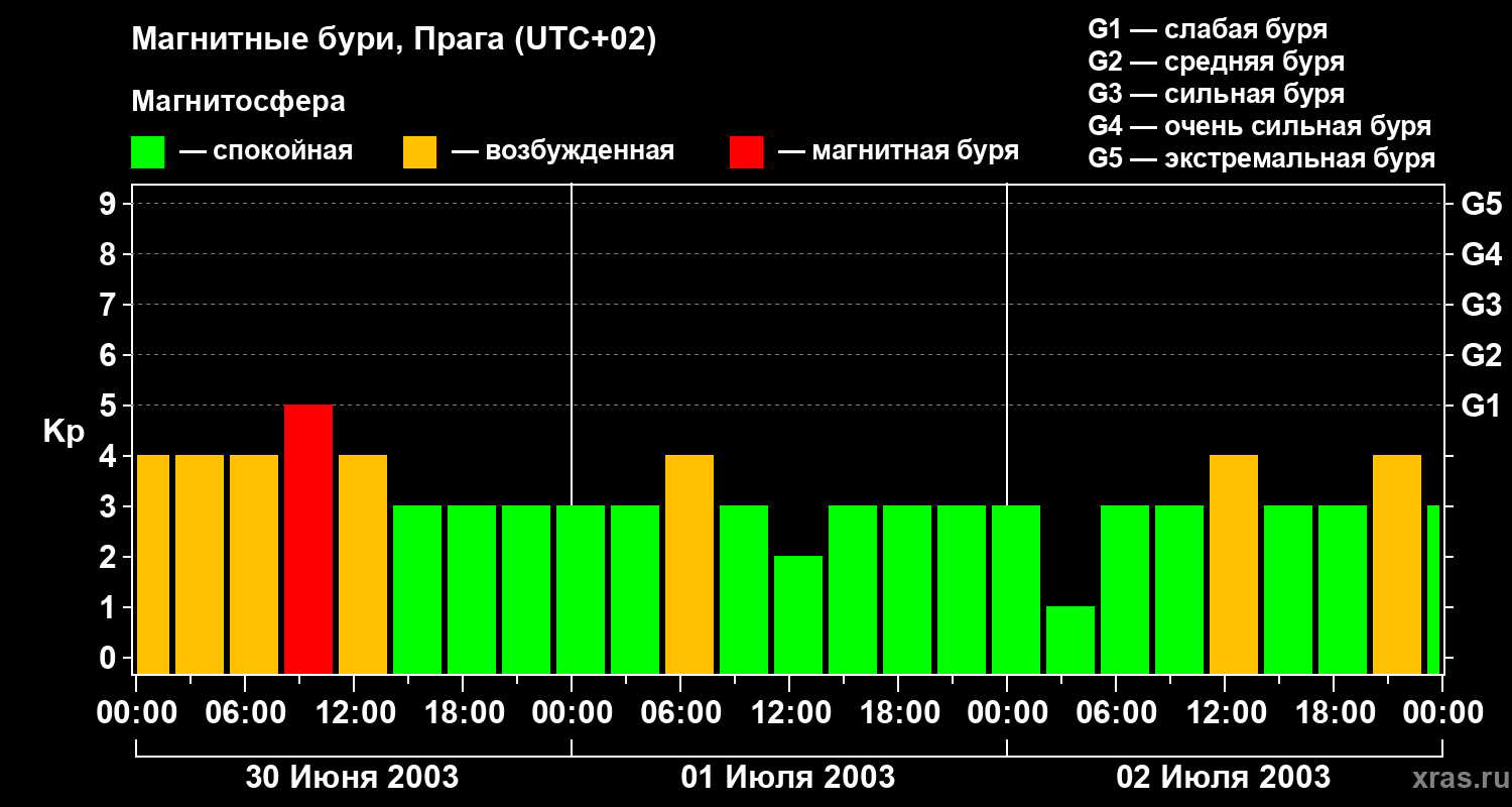 Изменения геомагнитного индекса Kp с 30 июня по 2 июля 2003 года для средних широт