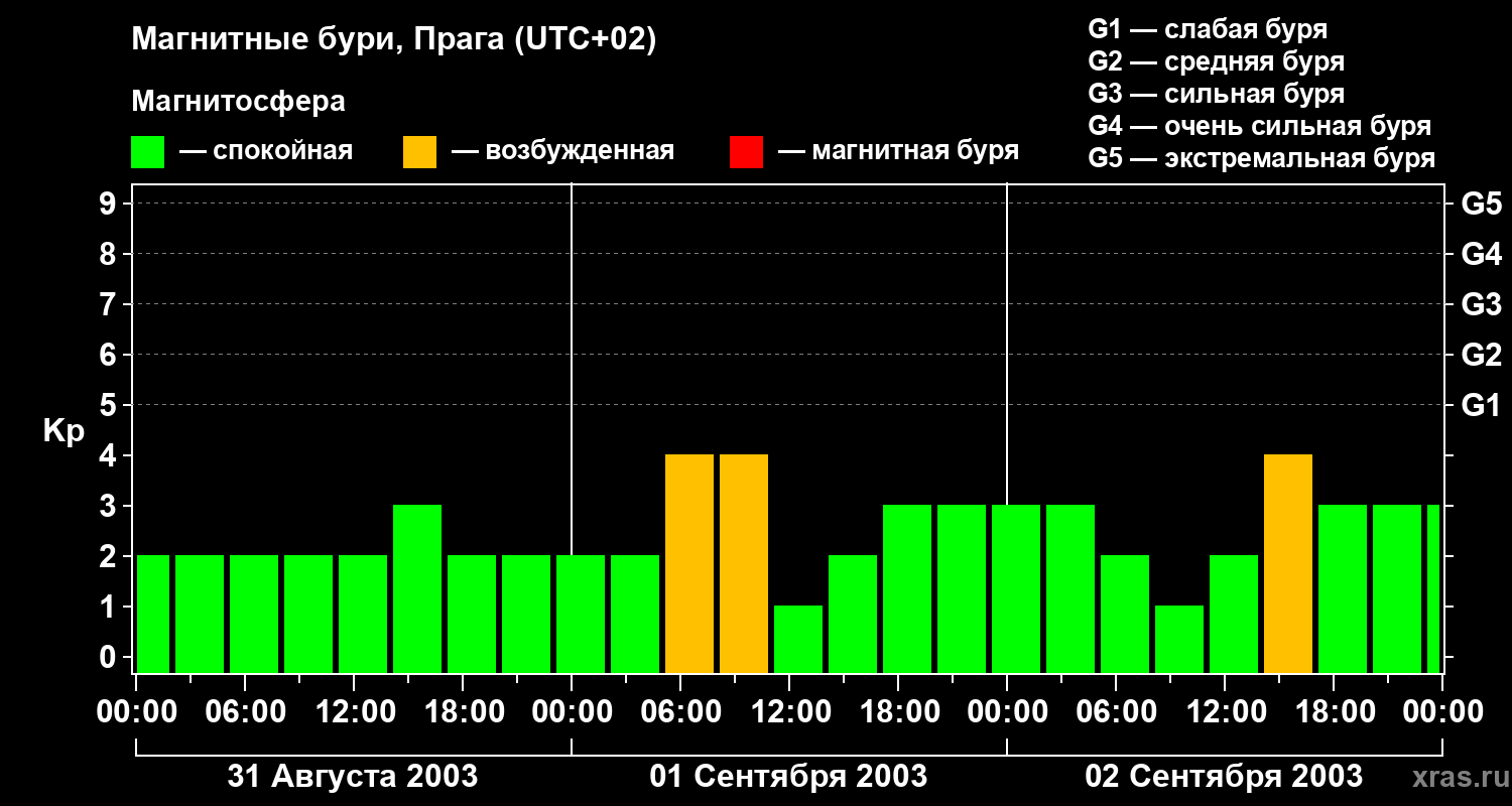Изменения геомагнитного индекса Kp с 31 августа по 2 сентября 2003 года для средних широт