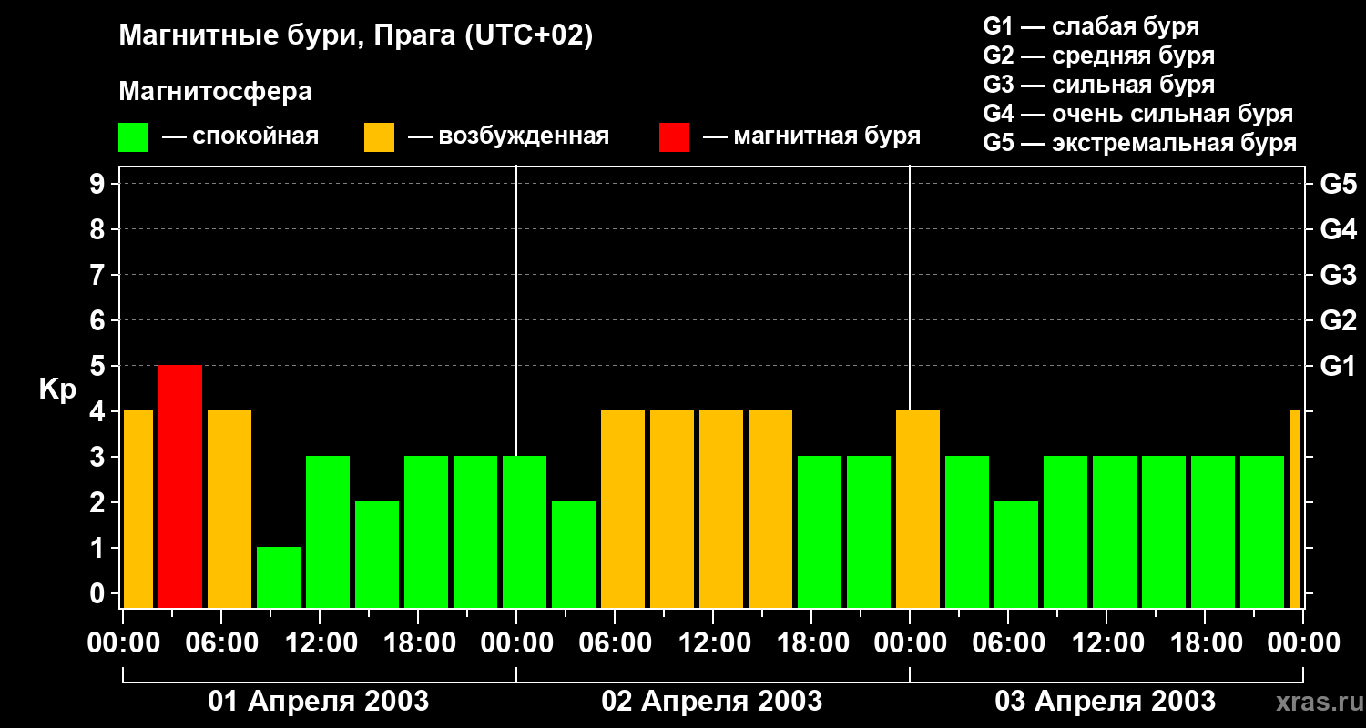 Изменения геомагнитного индекса Kp с 1 по 3 апреля 2003 года для средних широт