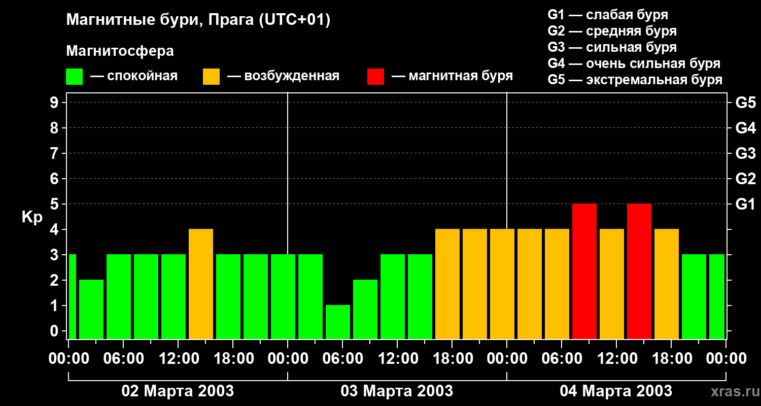 Изменения геомагнитного индекса Kp с 2 по 4 марта 2003 года для средних широт