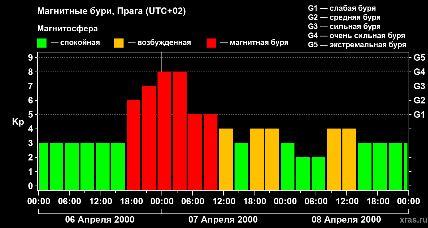 Изменения геомагнитного индекса Kp с 6 по 8 апреля 2000 года для средних широт
