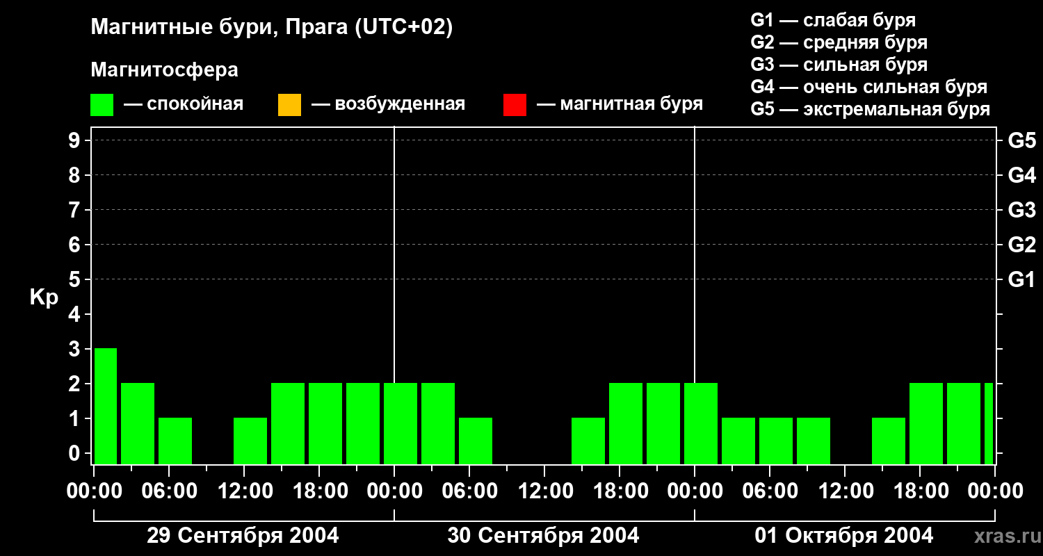 Изменения геомагнитного индекса Kp с 29 сентября по 1 октября 2004 года для средних широт