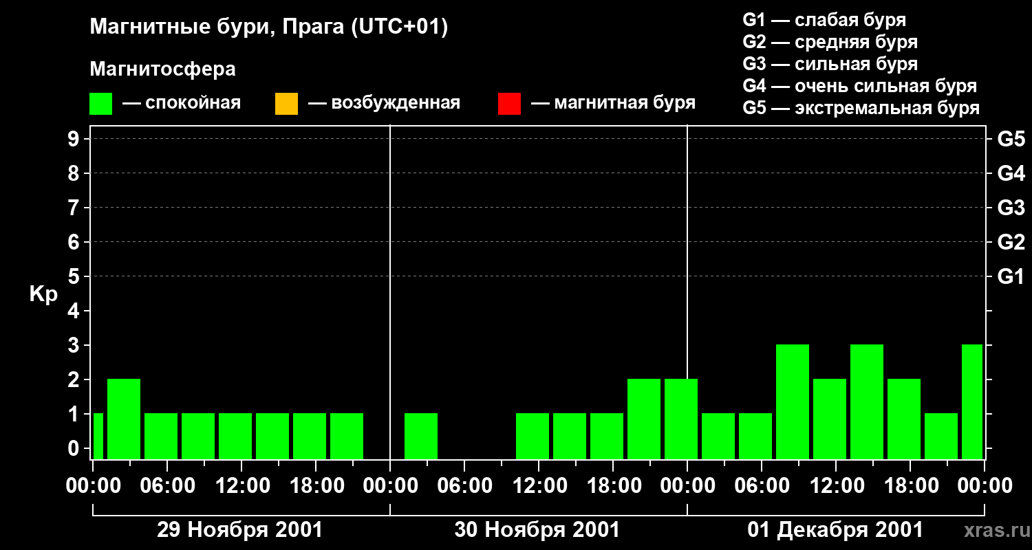 Изменения геомагнитного индекса Kp с 29 ноября по 1 декабря 2001 года для средних широт