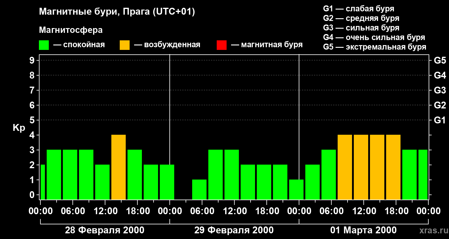 Изменения геомагнитного индекса Kp с 28 февраля по 1 марта 2000 года для средних широт