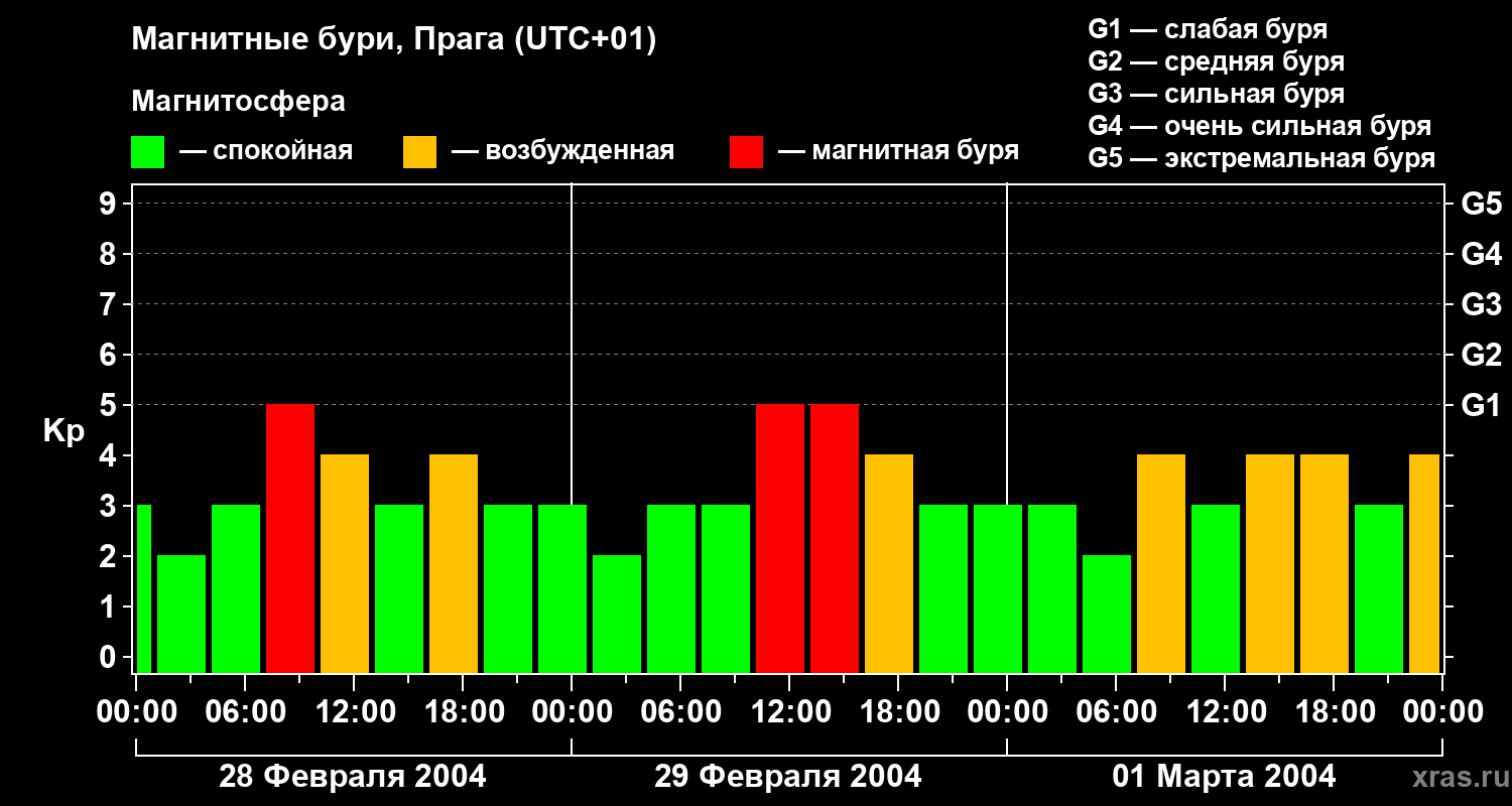 Изменения геомагнитного индекса Kp с 28 февраля по 1 марта 2004 года для средних широт