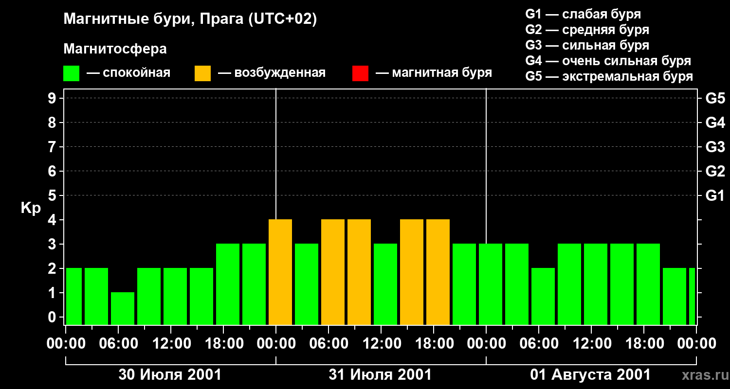 Изменения геомагнитного индекса Kp с 30 июля по 1 августа 2001 года для средних широт