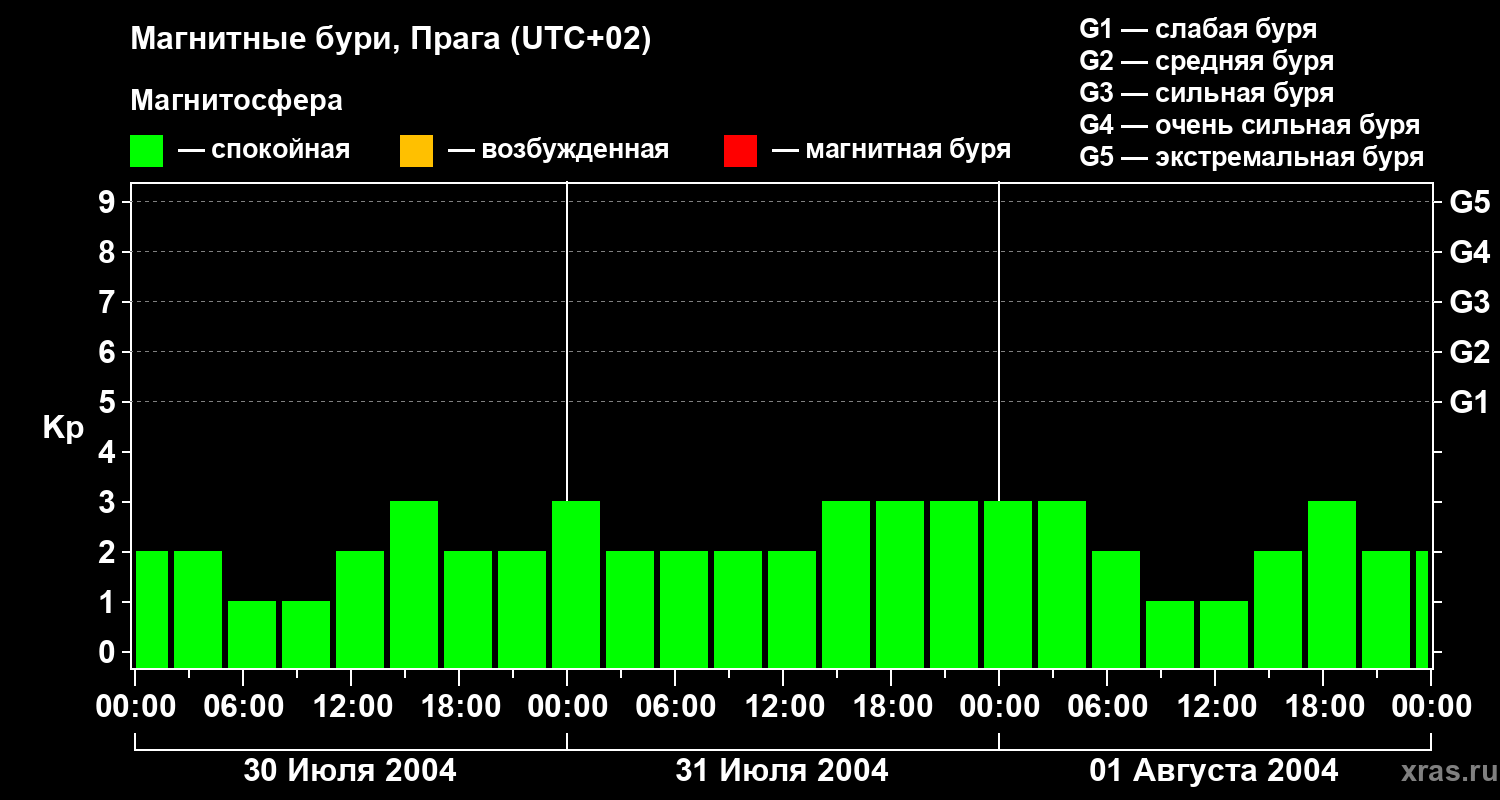 Изменения геомагнитного индекса Kp с 30 июля по 1 августа 2004 года для средних широт