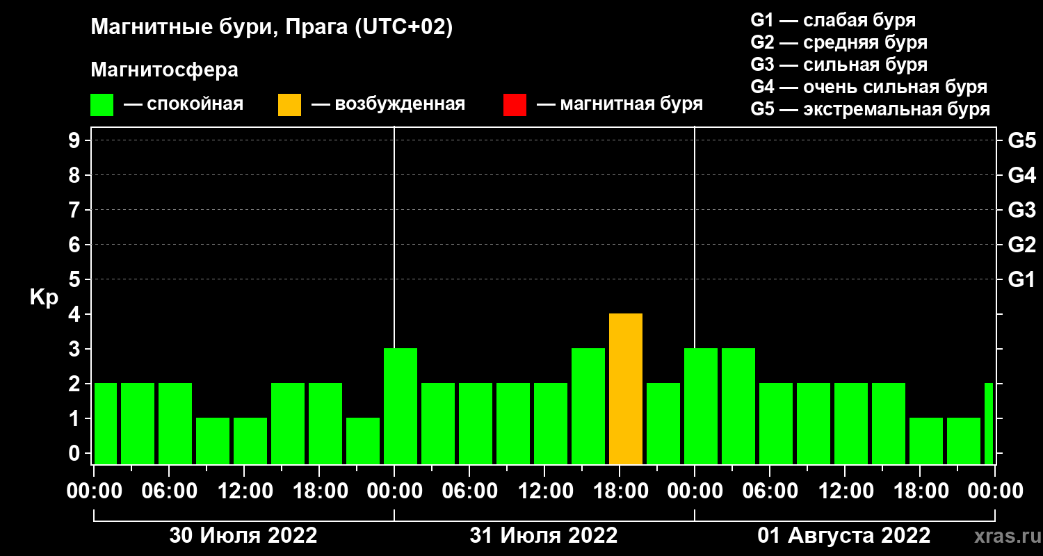 Изменения геомагнитного индекса Kp с 30 июля по 1 августа 2022 года для средних широт