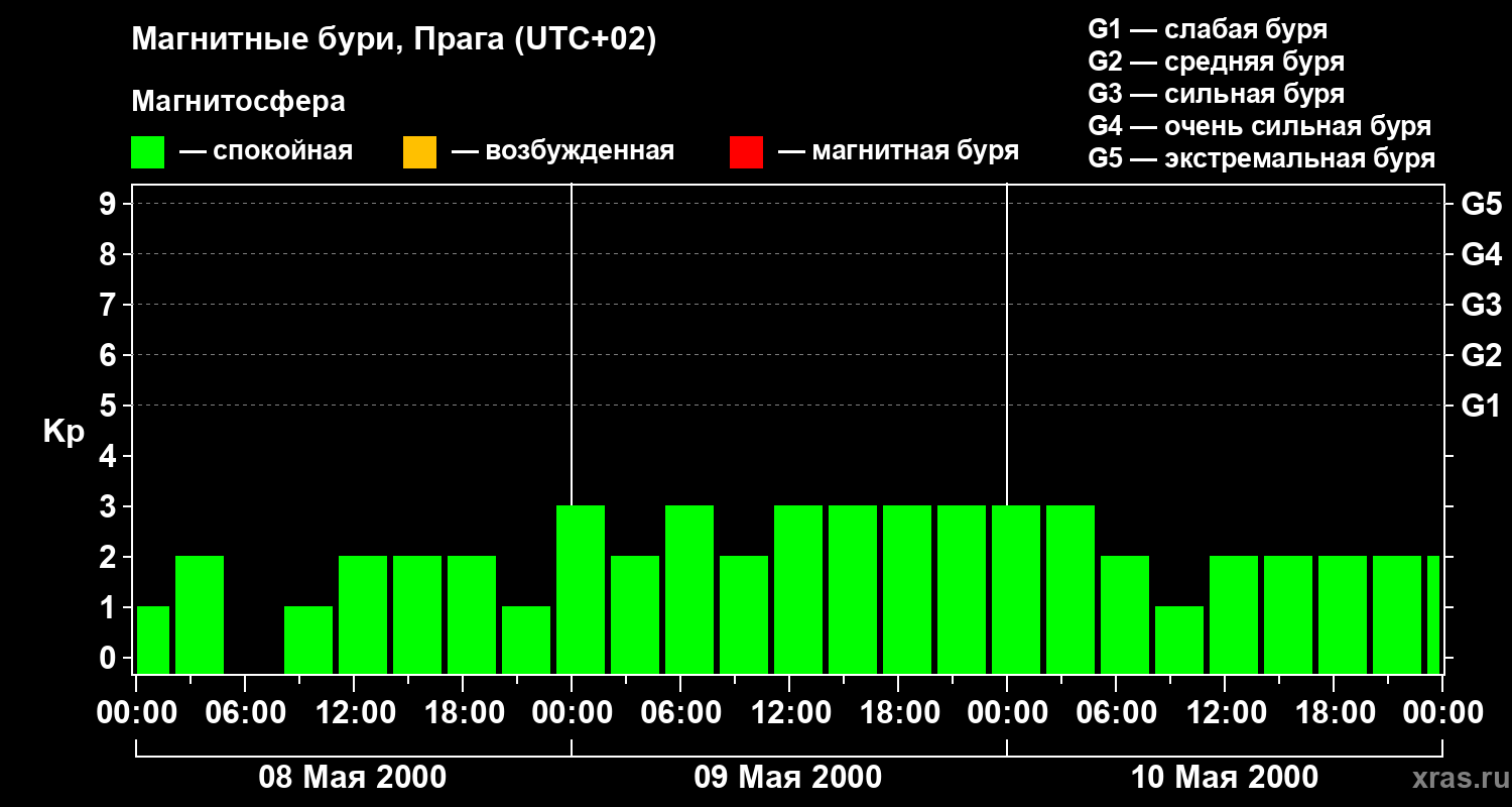Изменения геомагнитного индекса Kp с 8 по 10 мая 2000 года для средних широт