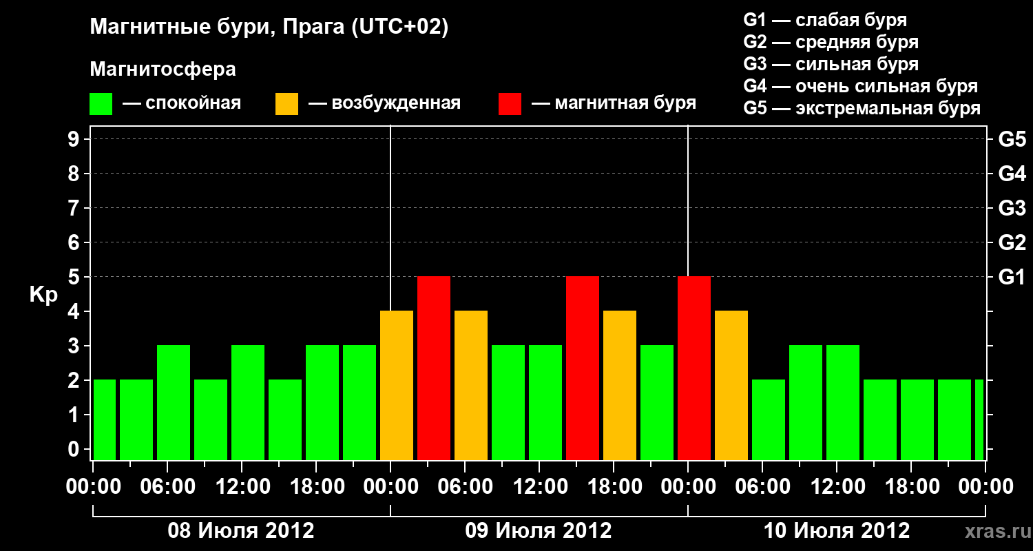 Изменения геомагнитного индекса Kp с 8 по 10 июля 2012 года для средних широт