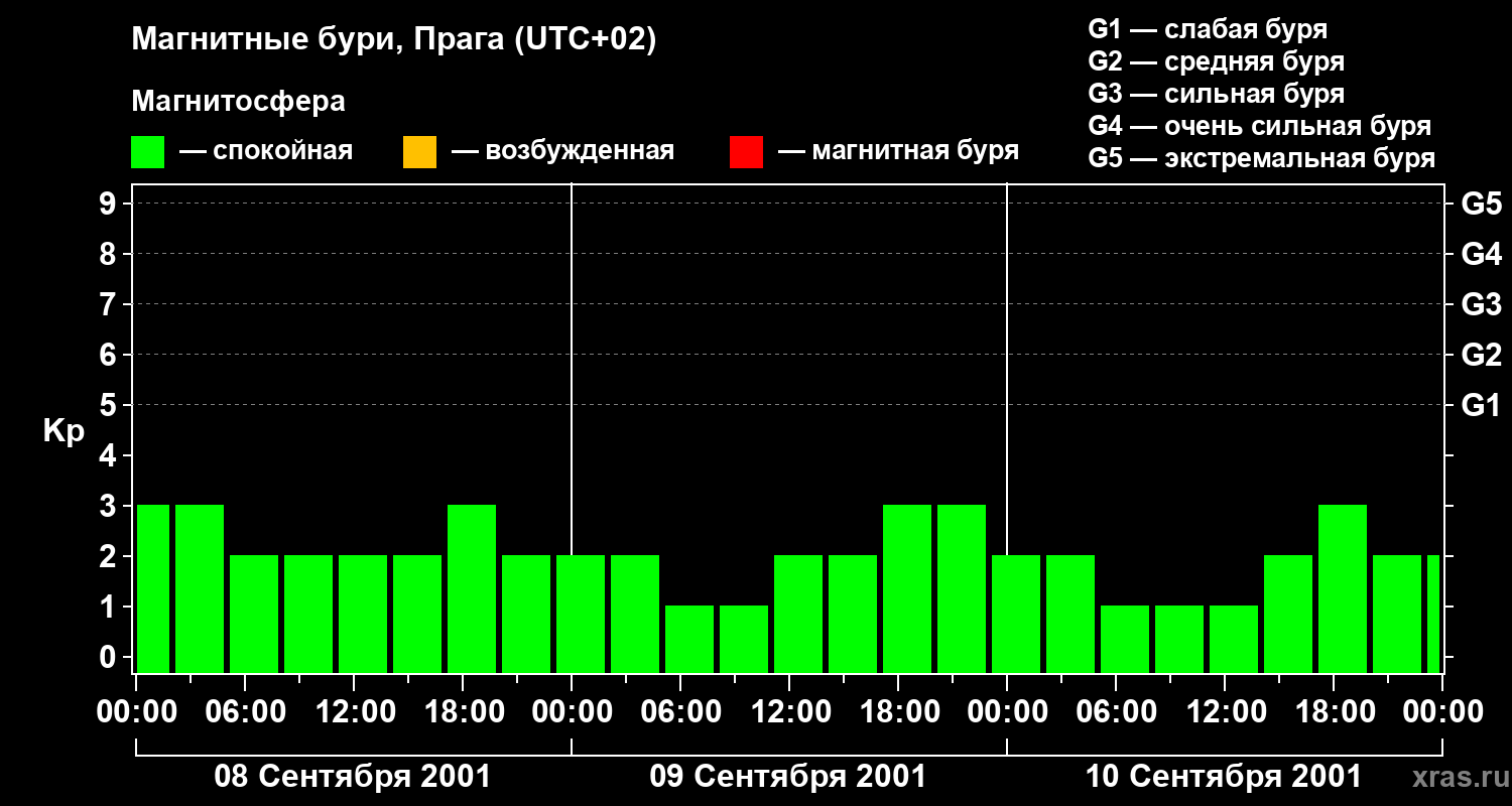 Изменения геомагнитного индекса Kp с 8 по 10 сентября 2001 года для средних широт