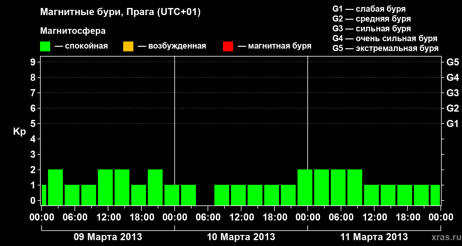 Изменения геомагнитного индекса Kp с 9 по 11 марта 2013 года для средних широт
