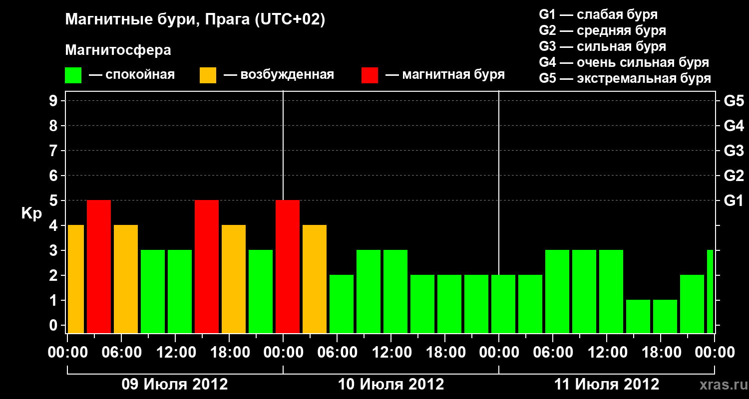 Изменения геомагнитного индекса Kp с 9 по 11 июля 2012 года для средних широт
