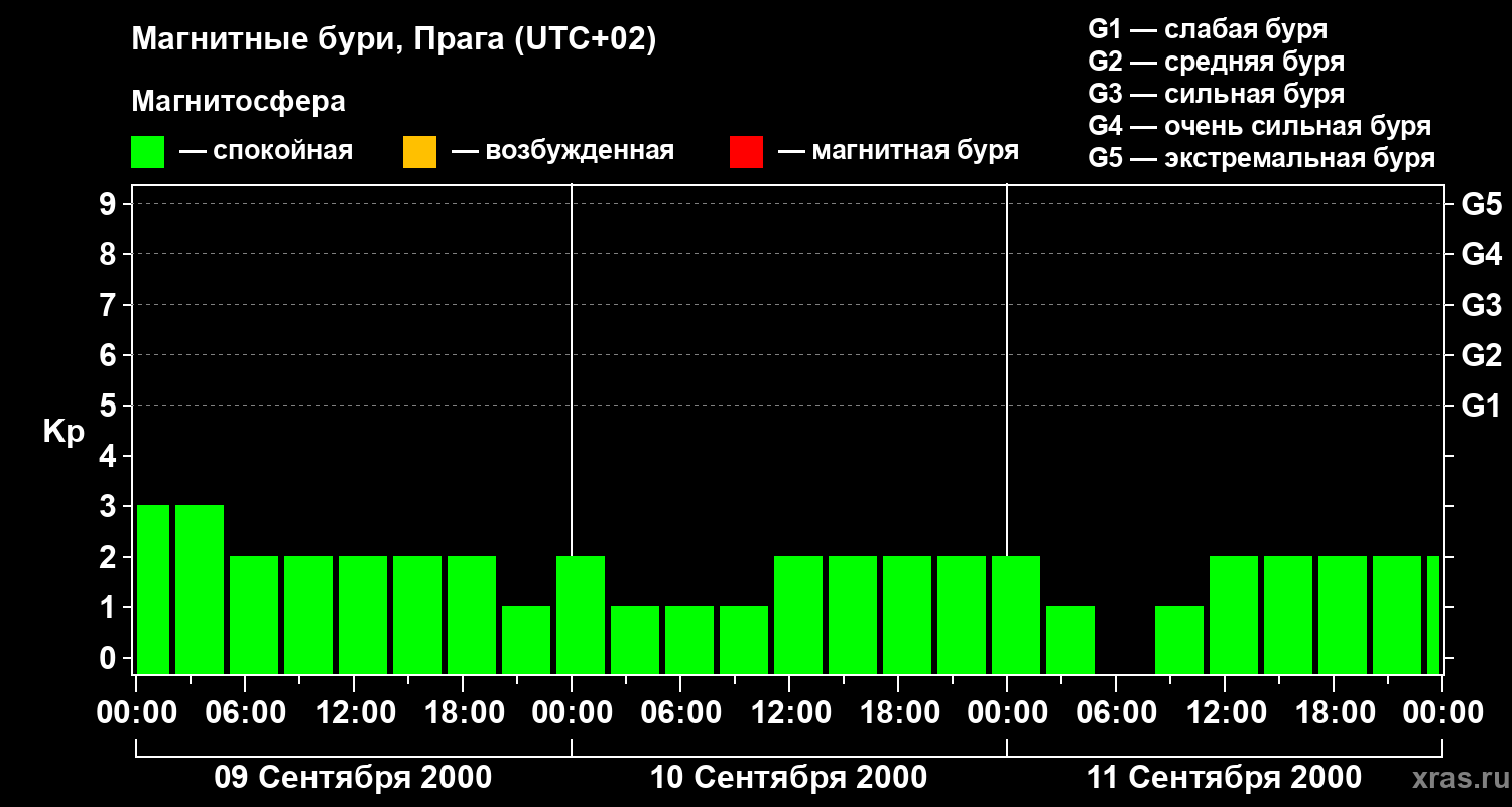 Изменения геомагнитного индекса Kp с 9 по 11 сентября 2000 года для средних широт