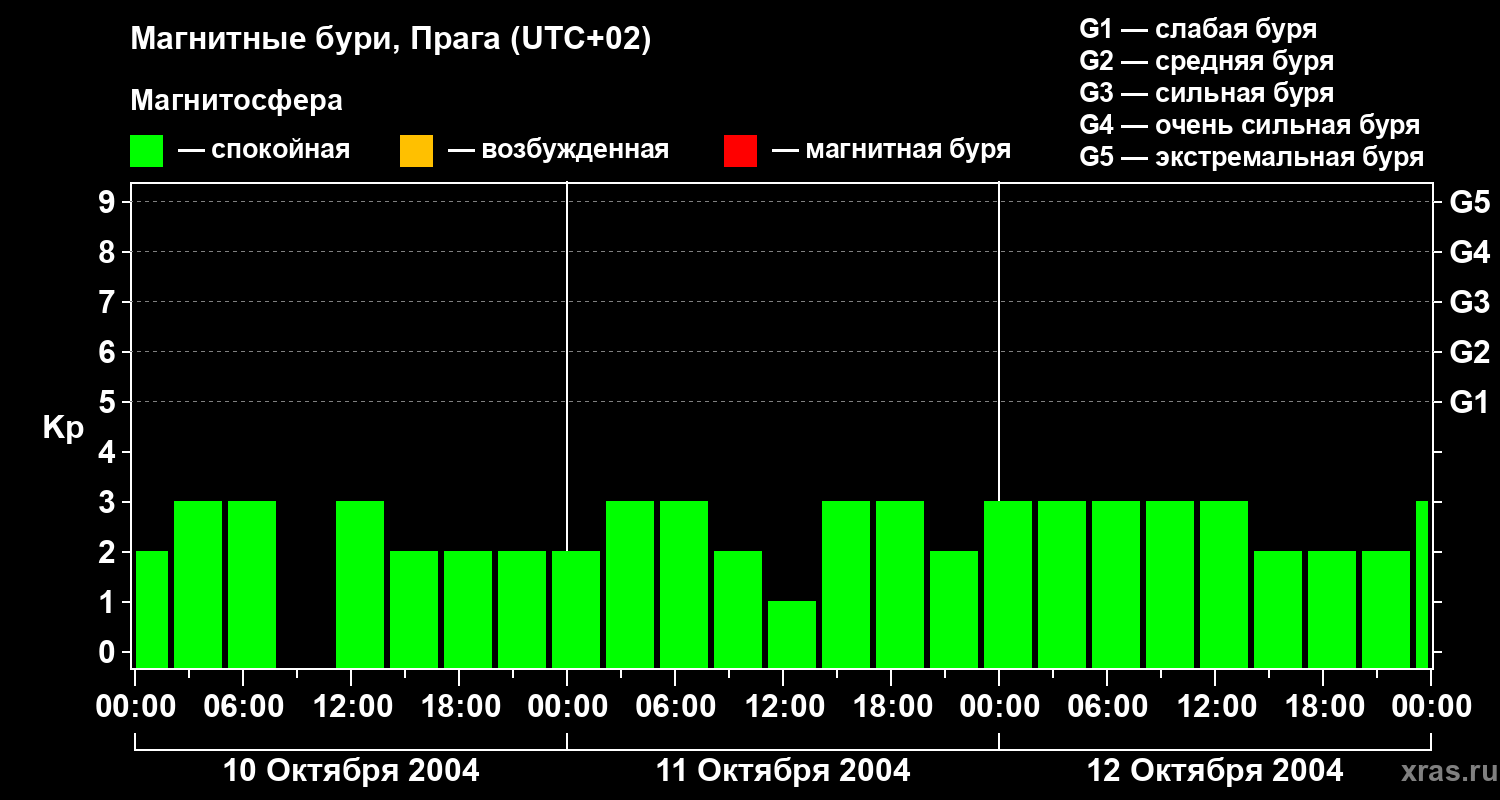 Изменения геомагнитного индекса Kp с 10 по 12 октября 2004 года для средних широт
