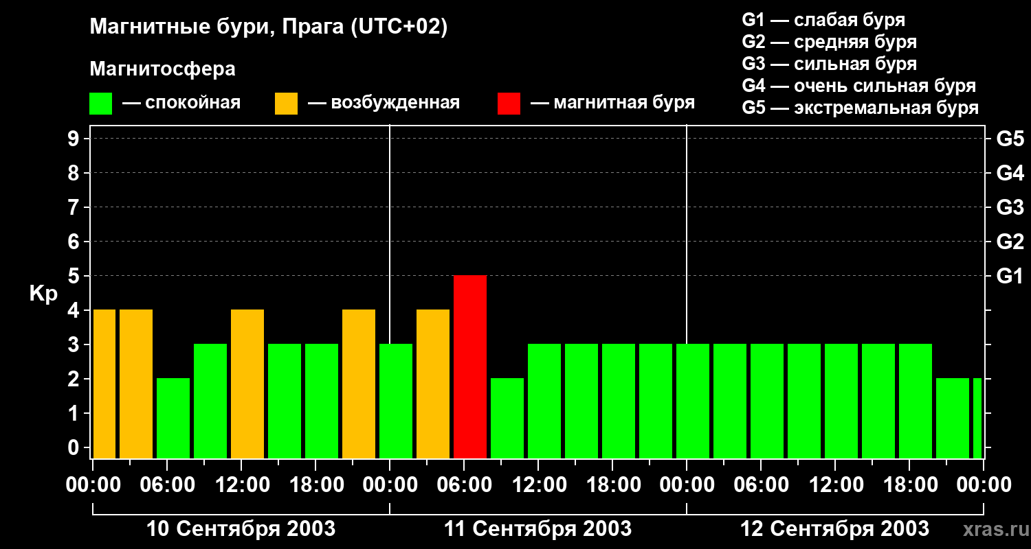 Изменения геомагнитного индекса Kp с 10 по 12 сентября 2003 года для средних широт