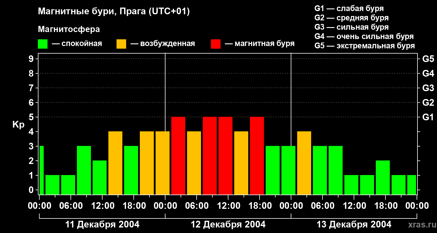 Изменения геомагнитного индекса Kp с 11 по 13 декабря 2004 года для средних широт
