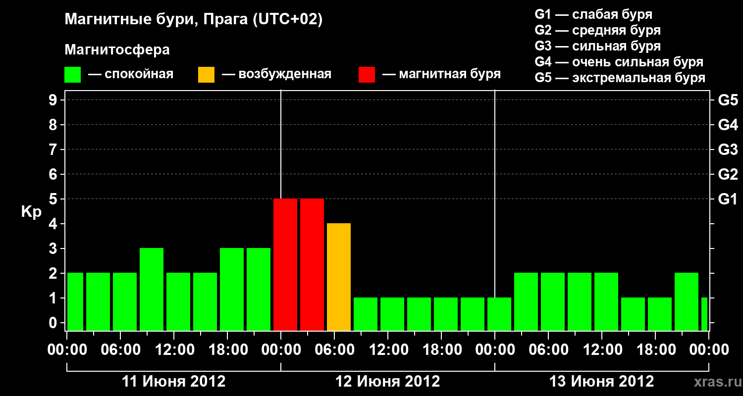 Изменения геомагнитного индекса Kp с 11 по 13 июня 2012 года для средних широт