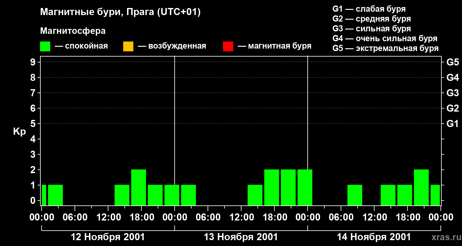 Изменения геомагнитного индекса Kp с 12 по 14 ноября 2001 года для средних широт