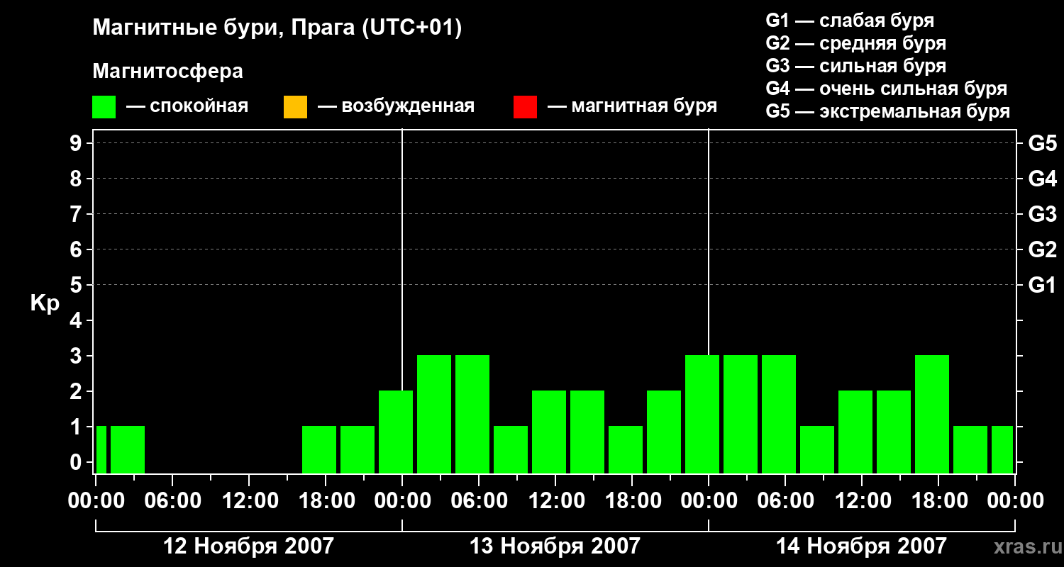 Изменения геомагнитного индекса Kp с 12 по 14 ноября 2007 года для средних широт