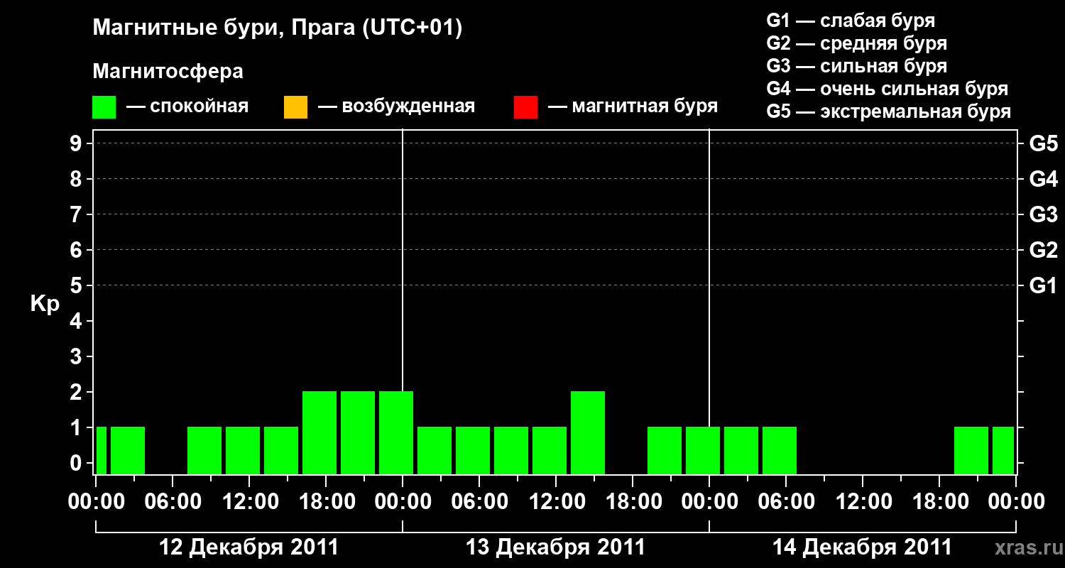 Изменения геомагнитного индекса Kp с 12 по 14 декабря 2011 года для средних широт