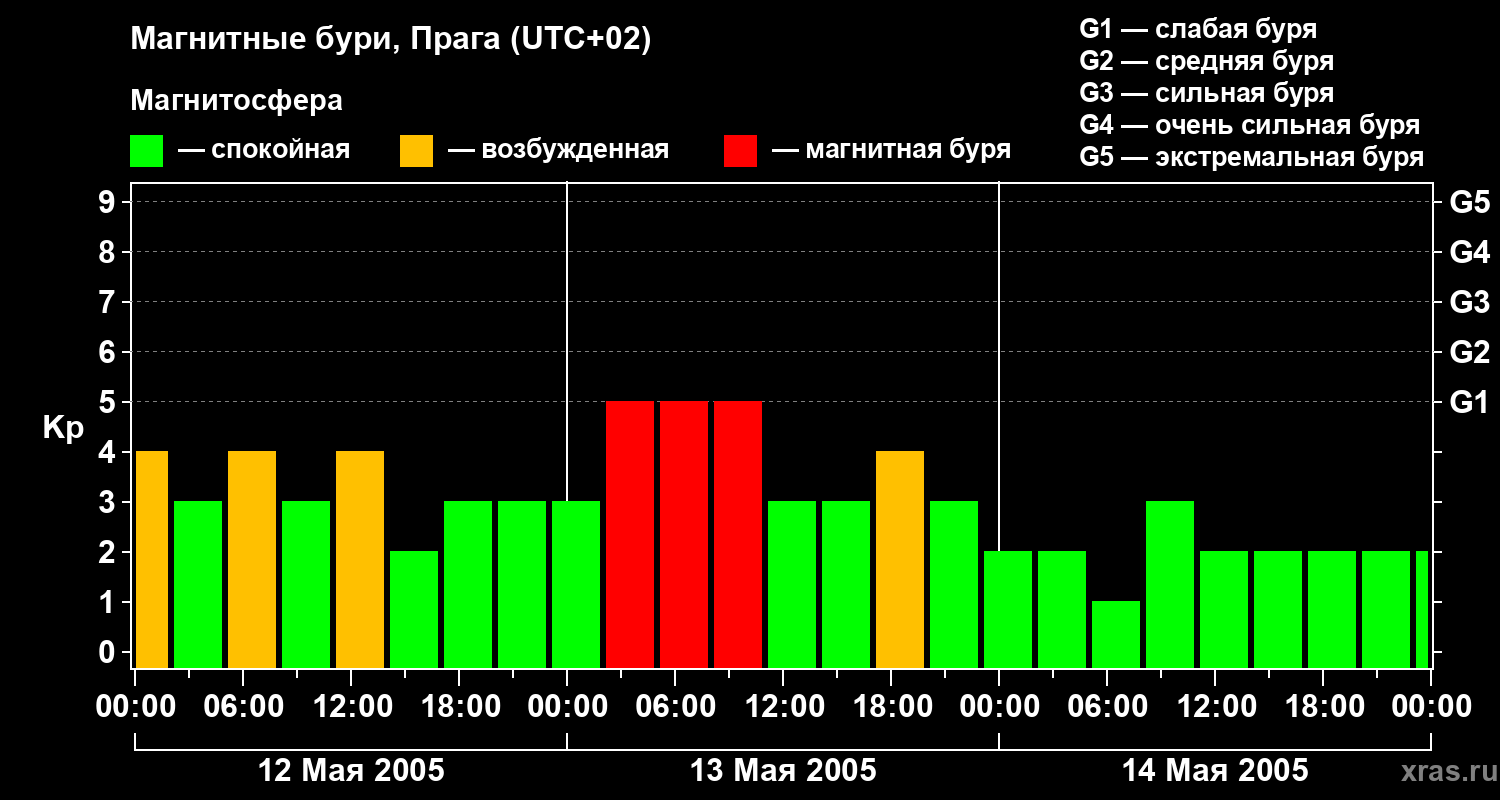 Изменения геомагнитного индекса Kp с 12 по 14 мая 2005 года для средних широт