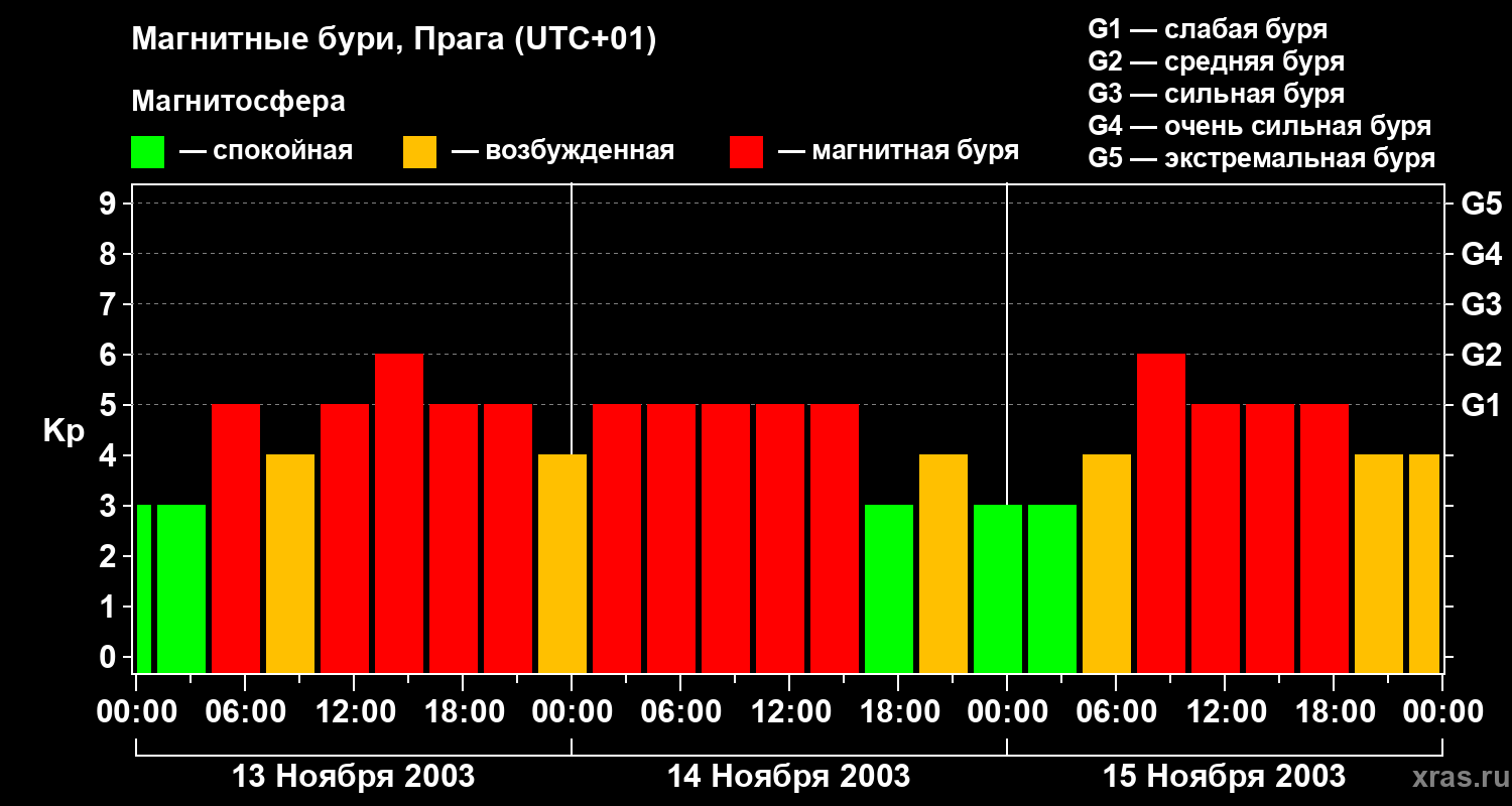 Изменения геомагнитного индекса Kp с 13 по 15 ноября 2003 года для средних широт