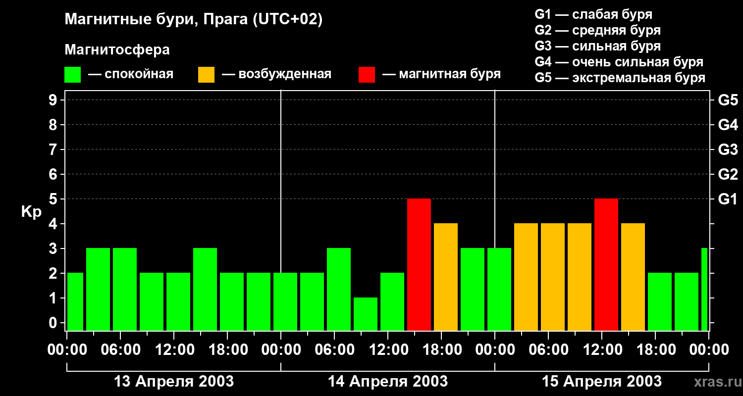Изменения геомагнитного индекса Kp с 13 по 15 апреля 2003 года для средних широт
