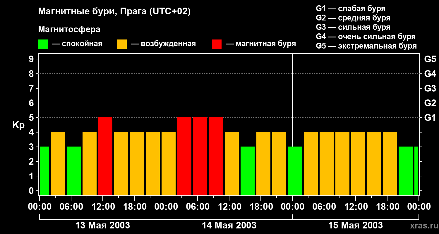 Изменения геомагнитного индекса Kp с 13 по 15 мая 2003 года для средних широт