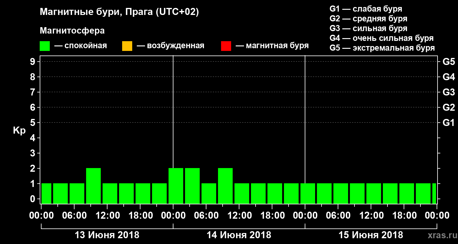 Изменения геомагнитного индекса Kp с 13 по 15 июня 2018 года для средних широт