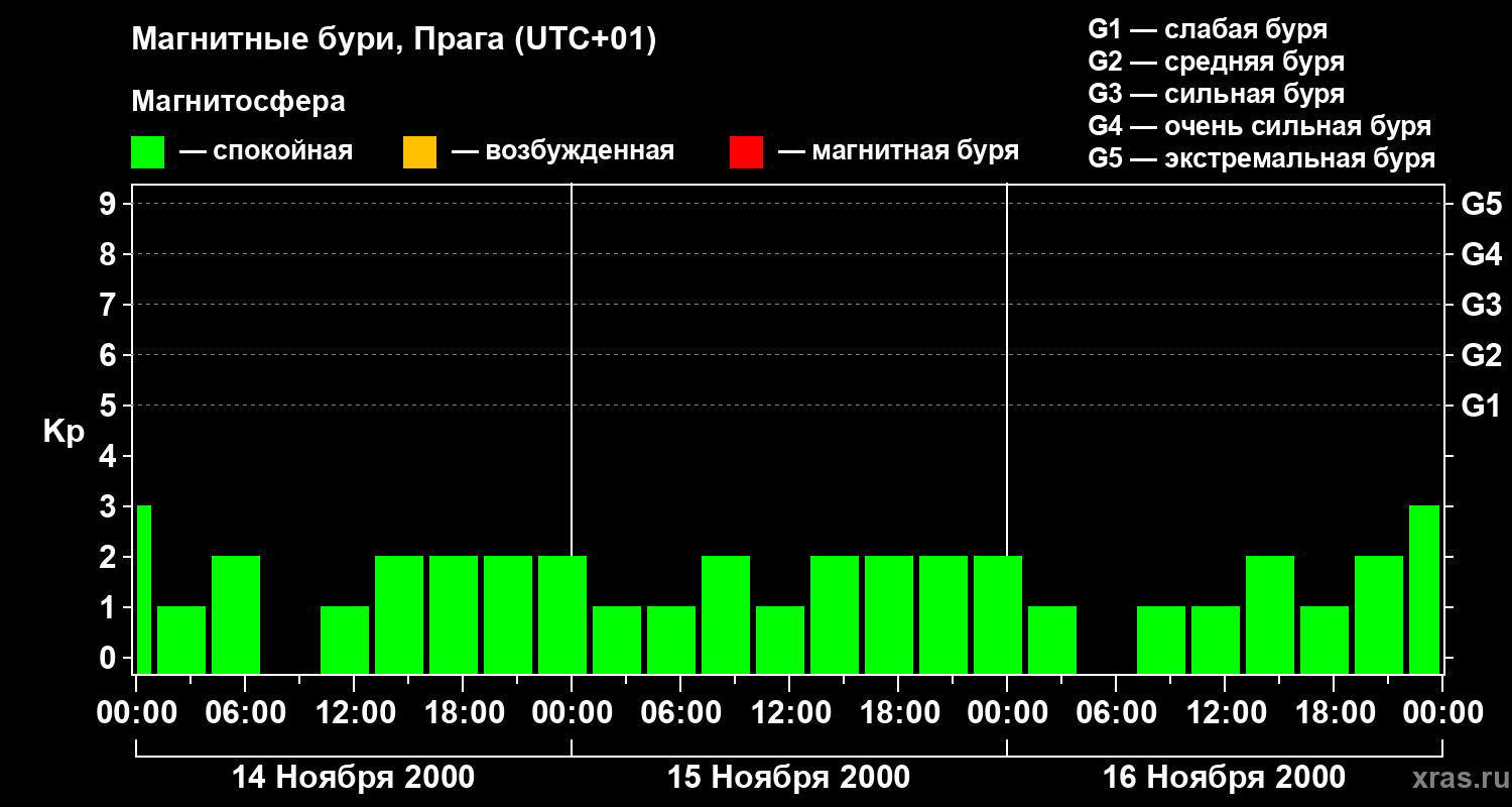 Изменения геомагнитного индекса Kp с 14 по 16 ноября 2000 года для средних широт
