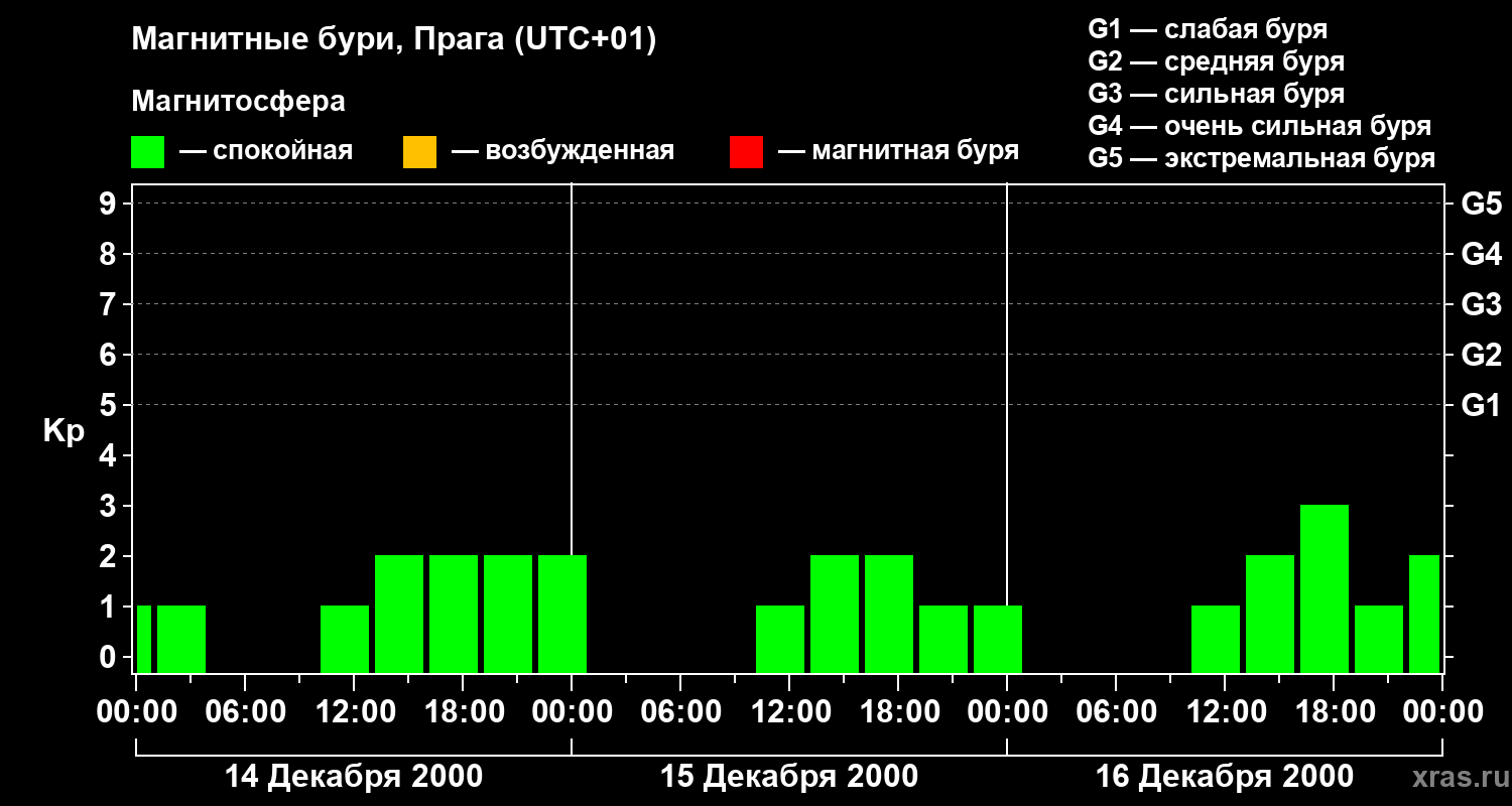 Изменения геомагнитного индекса Kp с 14 по 16 декабря 2000 года для средних широт