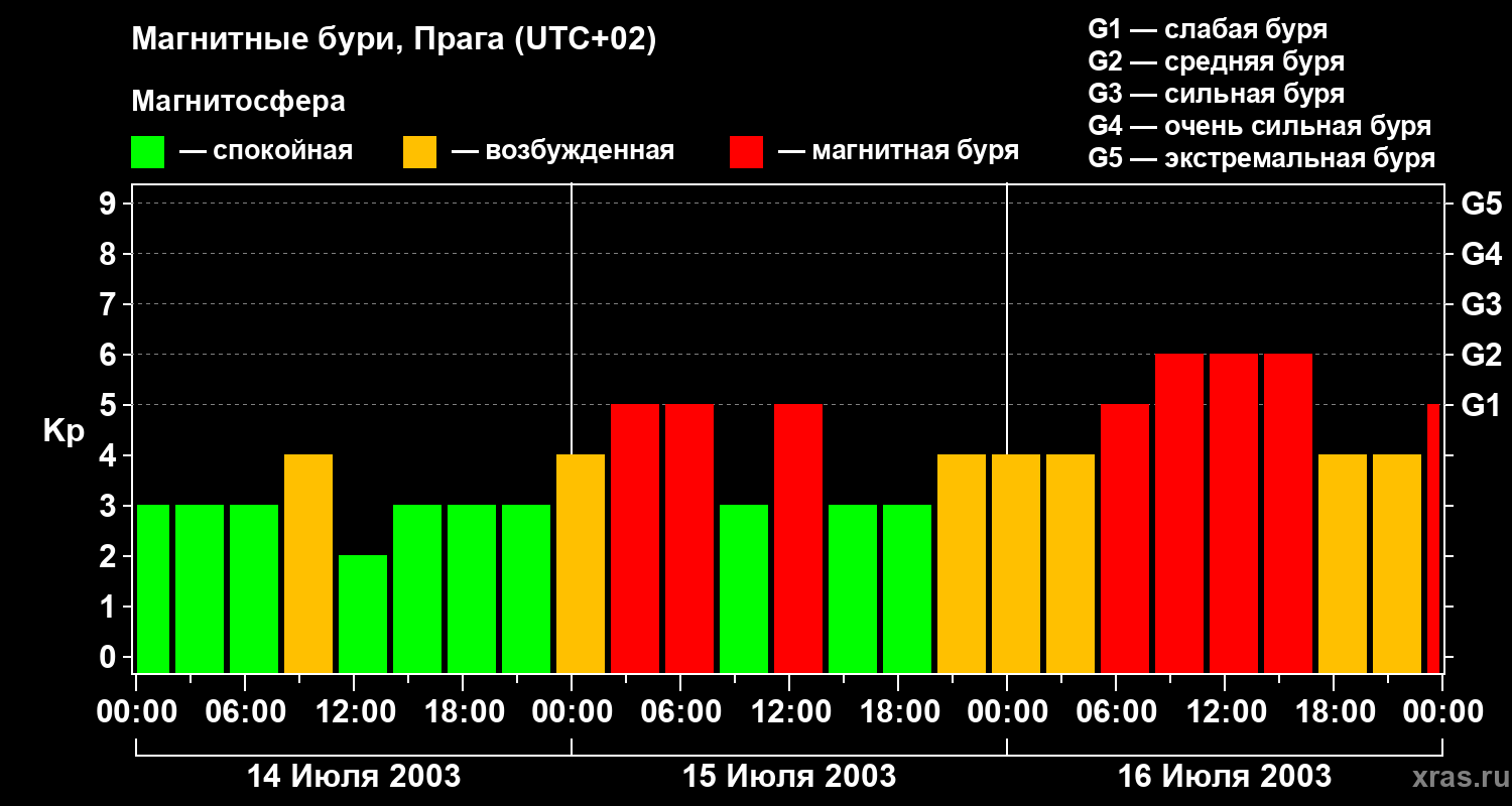Изменения геомагнитного индекса Kp с 14 по 16 июля 2003 года для средних широт