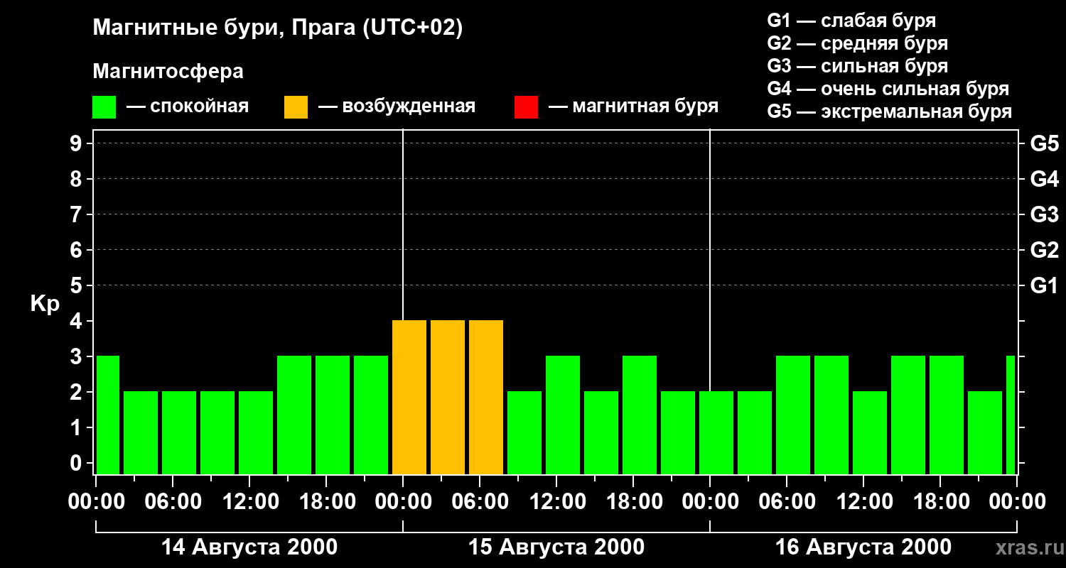 Изменения геомагнитного индекса Kp с 14 по 16 августа 2000 года для средних широт