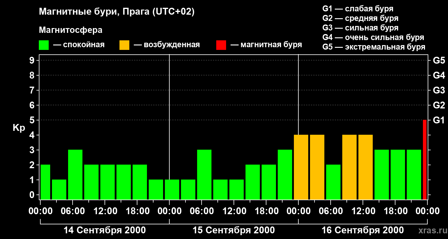 Изменения геомагнитного индекса Kp с 14 по 16 сентября 2000 года для средних широт