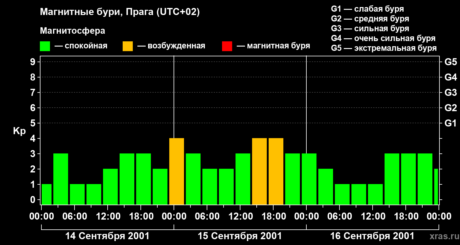 Изменения геомагнитного индекса Kp с 14 по 16 сентября 2001 года для средних широт
