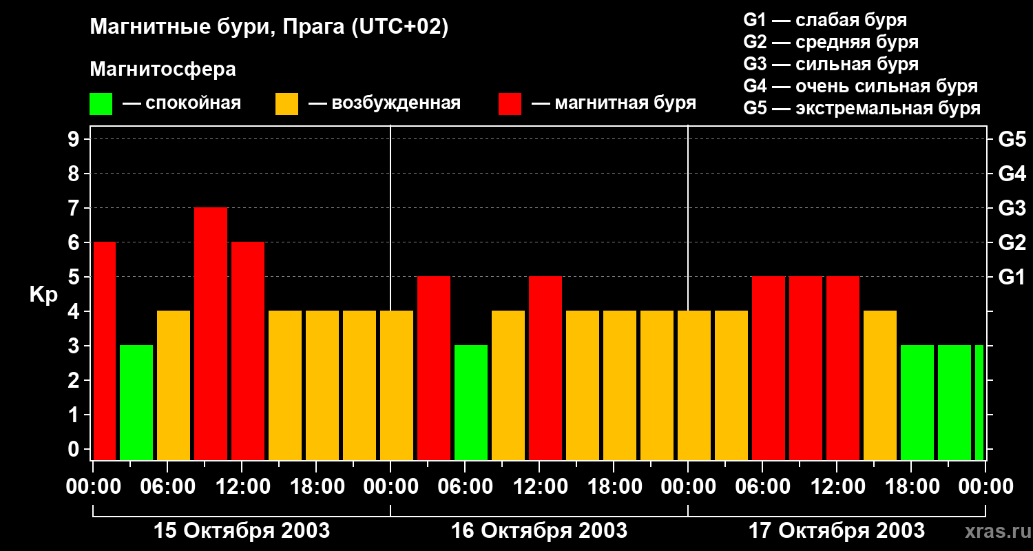 Изменения геомагнитного индекса Kp с 15 по 17 октября 2003 года для средних широт