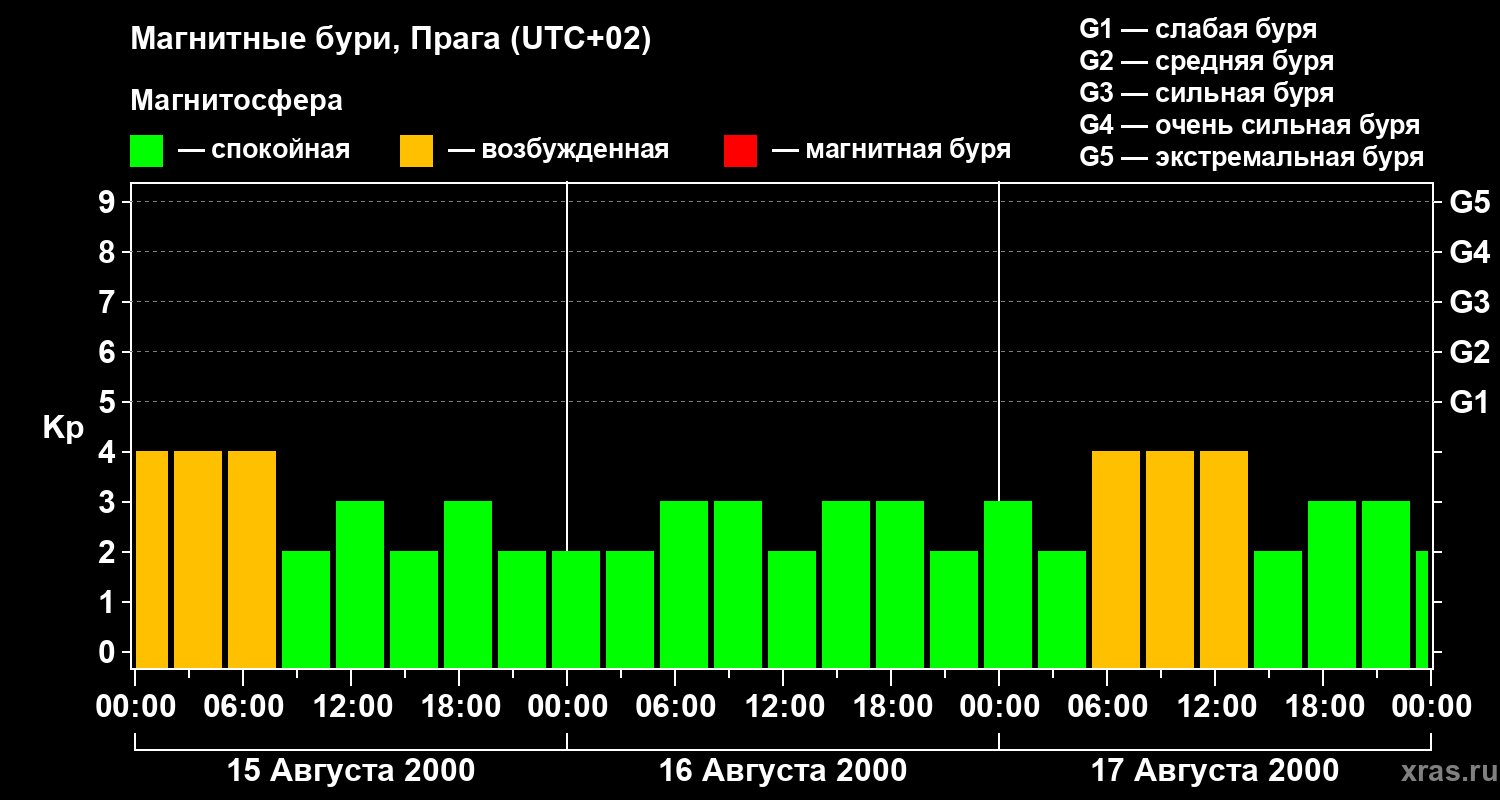 Изменения геомагнитного индекса Kp с 15 по 17 августа 2000 года для средних широт