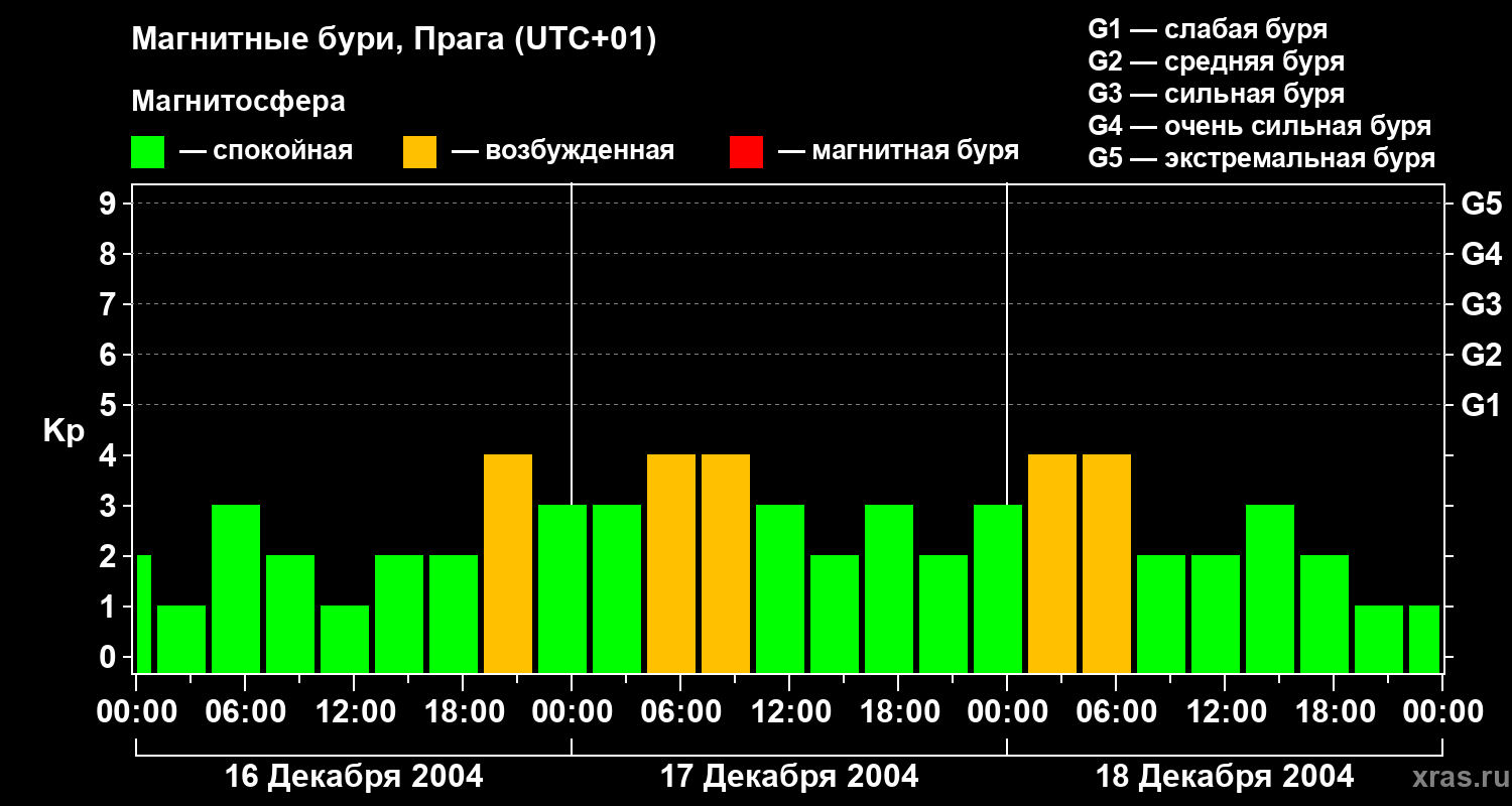 Изменения геомагнитного индекса Kp с 16 по 18 декабря 2004 года для средних широт