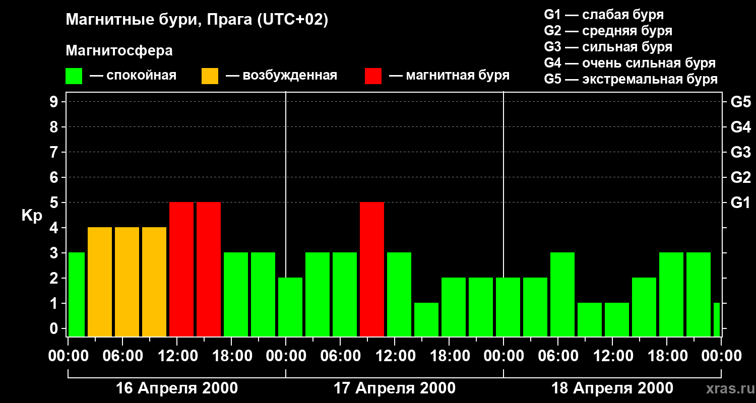 Изменения геомагнитного индекса Kp с 16 по 18 апреля 2000 года для средних широт