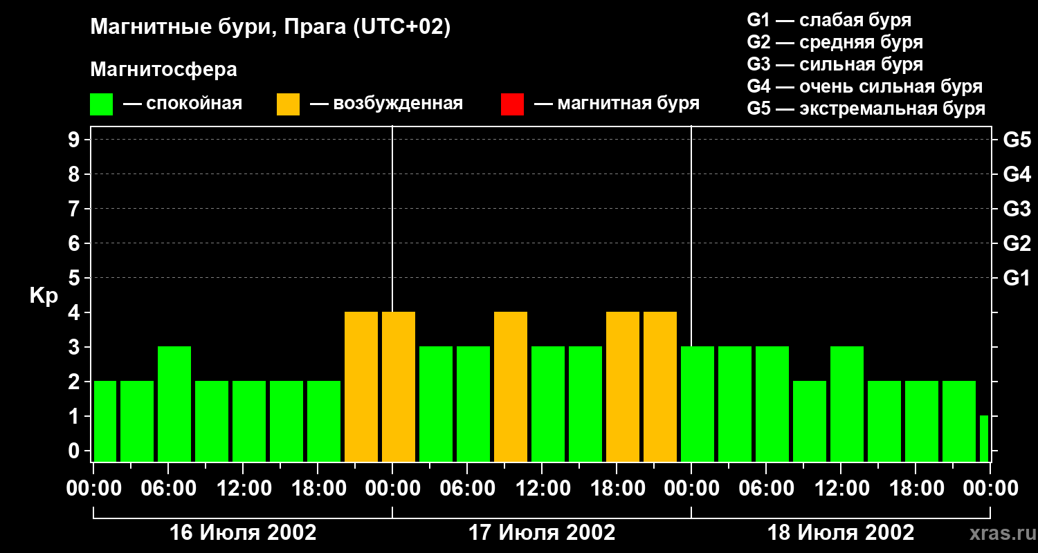 Изменения геомагнитного индекса Kp с 16 по 18 июля 2002 года для средних широт