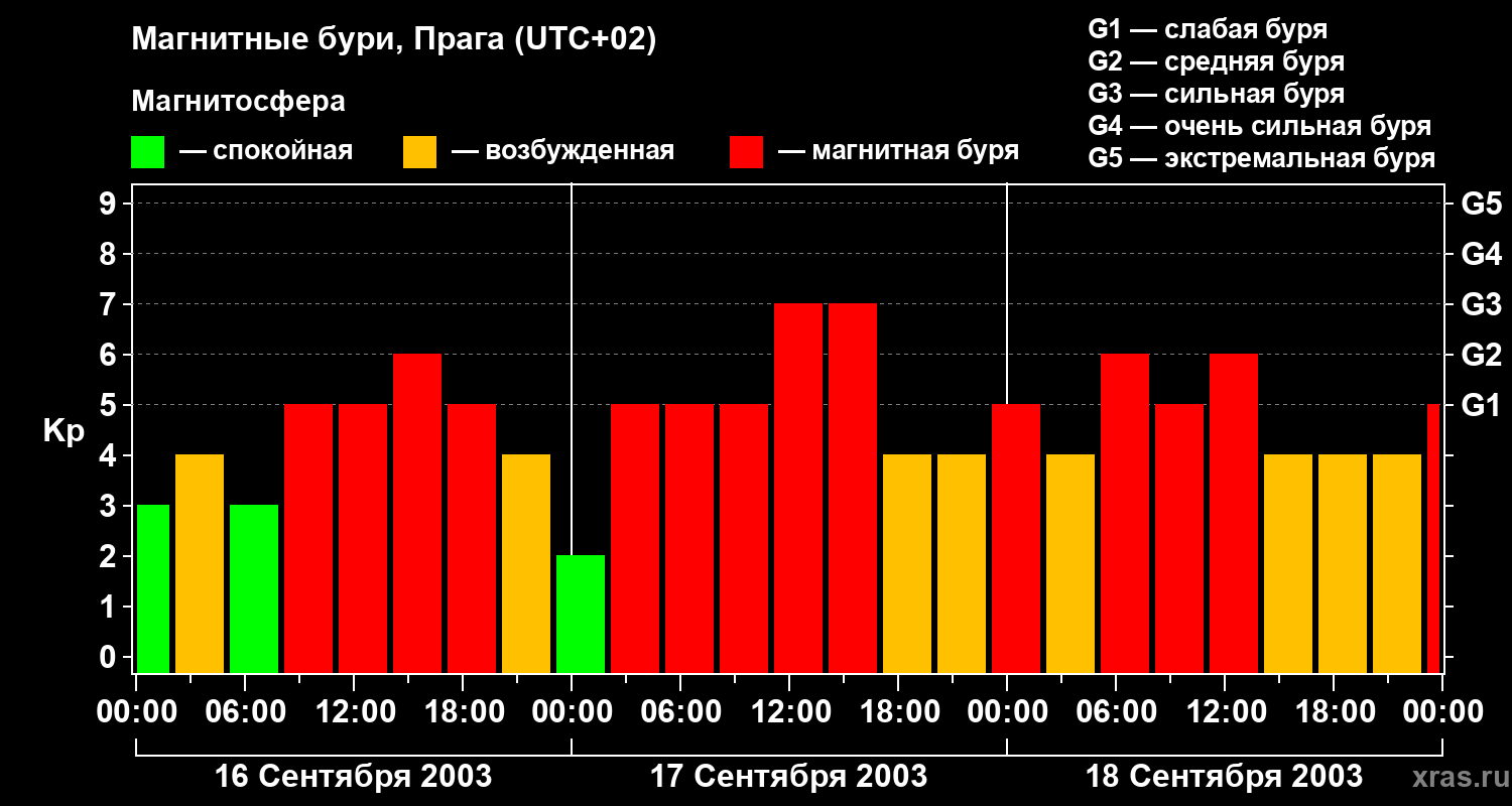 Изменения геомагнитного индекса Kp с 16 по 18 сентября 2003 года для средних широт