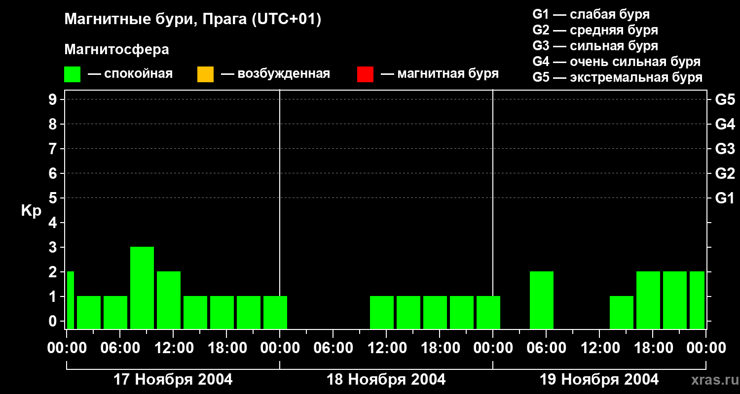 Изменения геомагнитного индекса Kp с 17 по 19 ноября 2004 года для средних широт