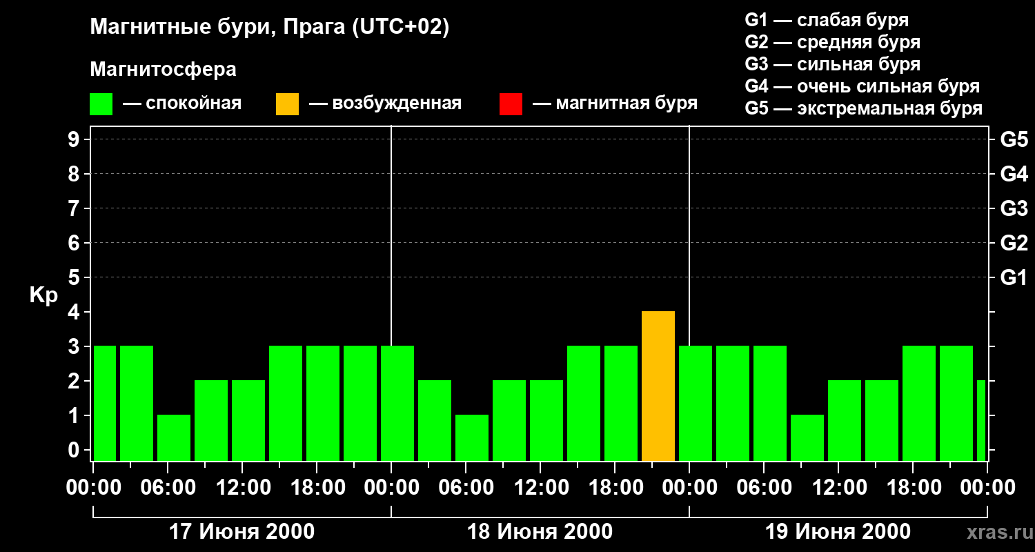Изменения геомагнитного индекса Kp с 17 по 19 июня 2000 года для средних широт