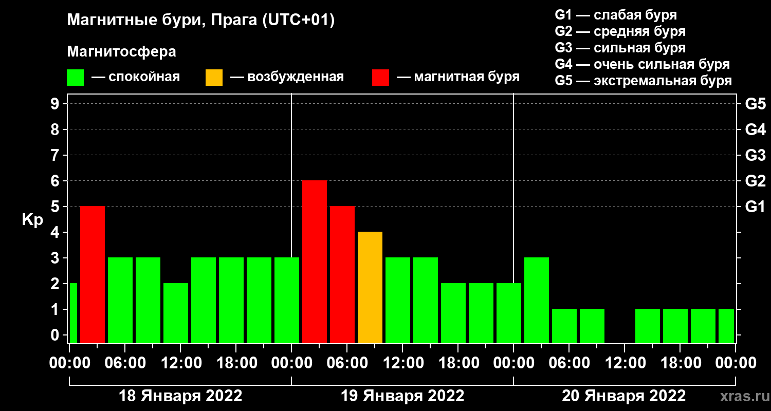 Изменения геомагнитного индекса Kp с 18 по 20 января 2022 года для средних широт