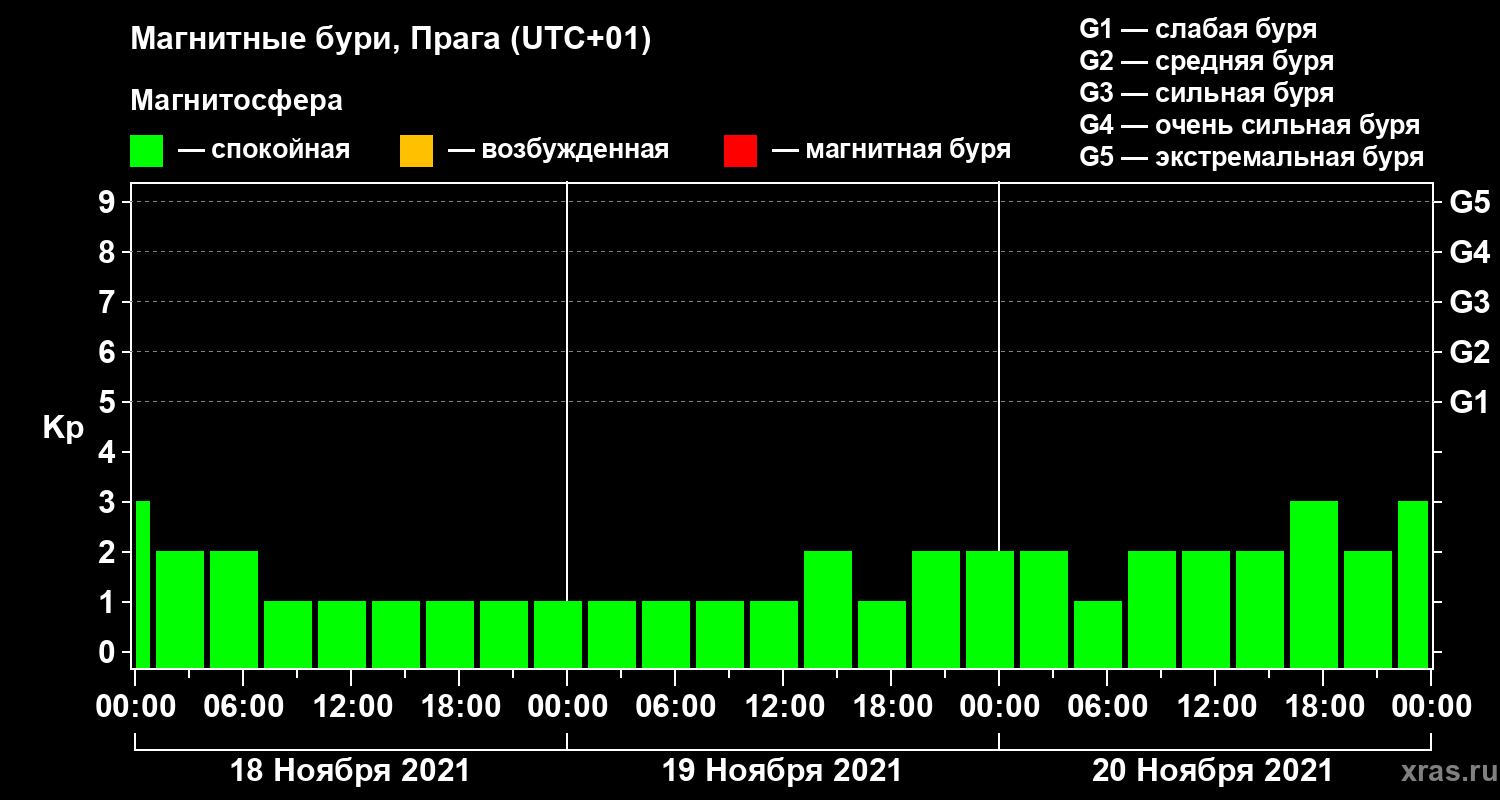 Изменения геомагнитного индекса Kp с 18 по 20 ноября 2021 года для средних широт